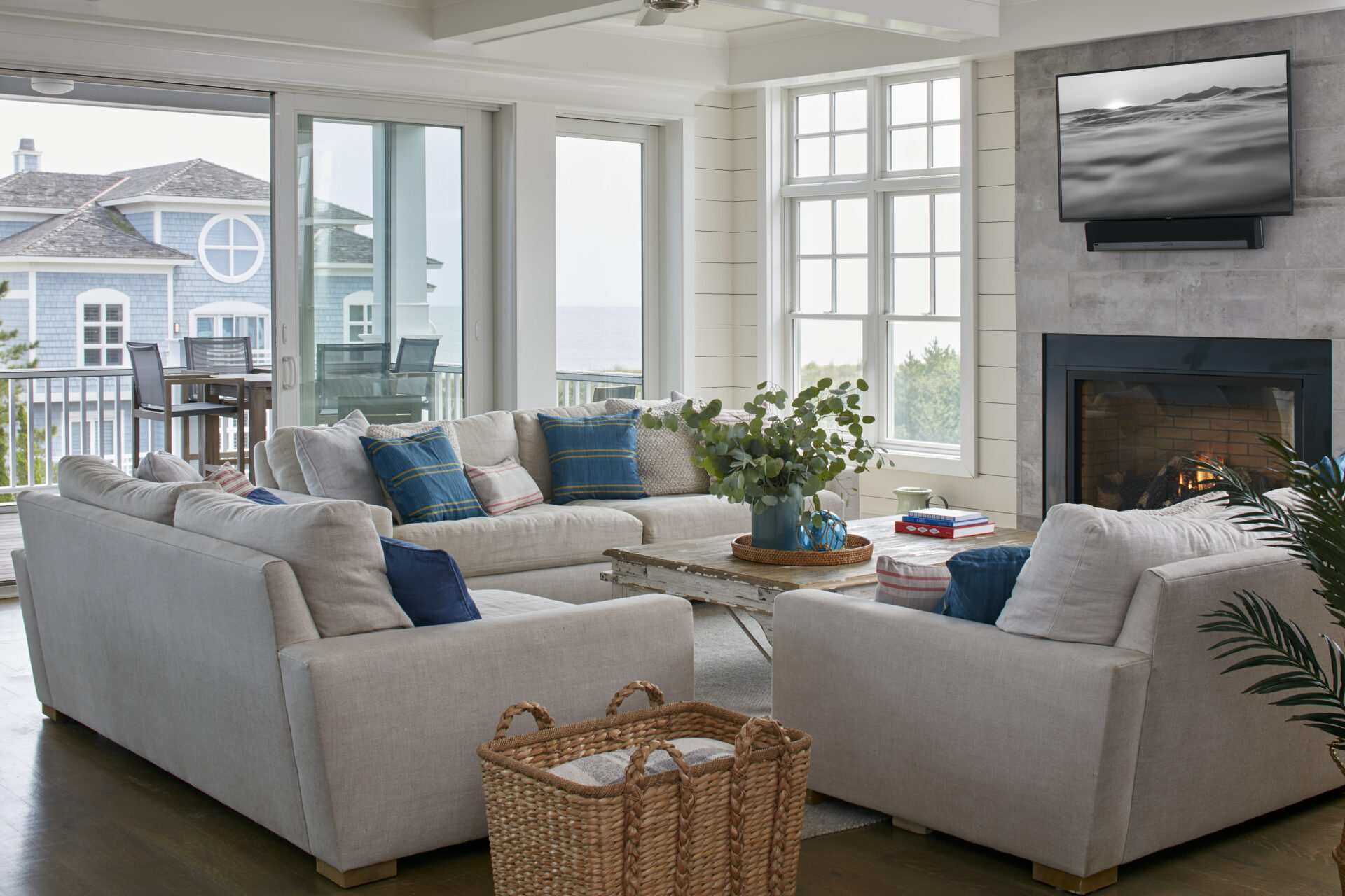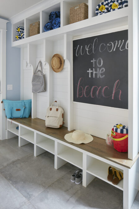 Uniquely-designed interior doors include a 4’ reclaimed wood sliding barn door, a shiplap door with a custom WWII porthole window that was turned into a mirror, an old wood interior door, and a Dutch door leading to the beach prep room that has everything you need to get ready for a day on the beach.