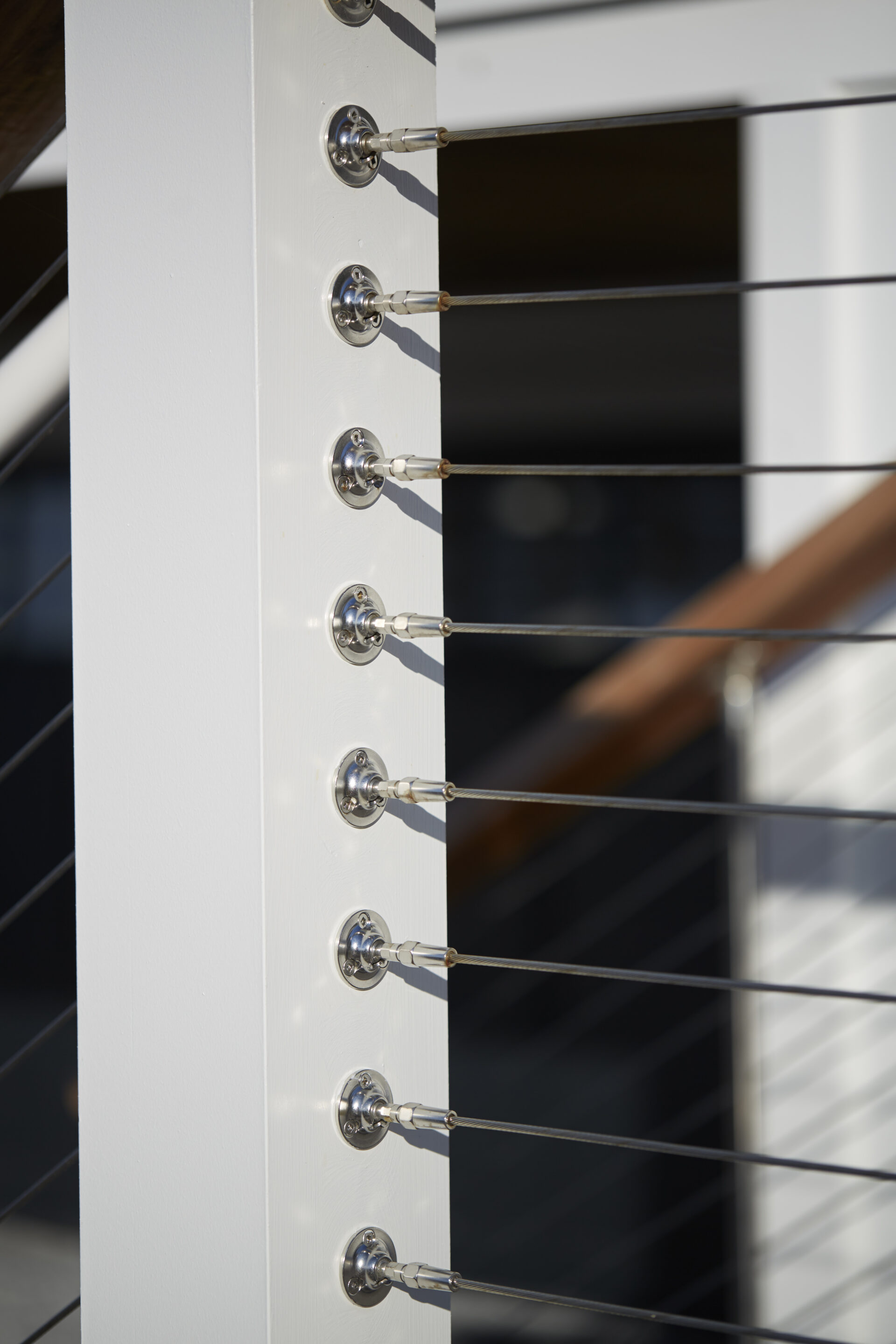 From the primary bedroom, sliding glass doors open to a balcony that overlooks the water. A sleek and modern exterior with white NuCedar siding was used for a striking contrast against the black windows.