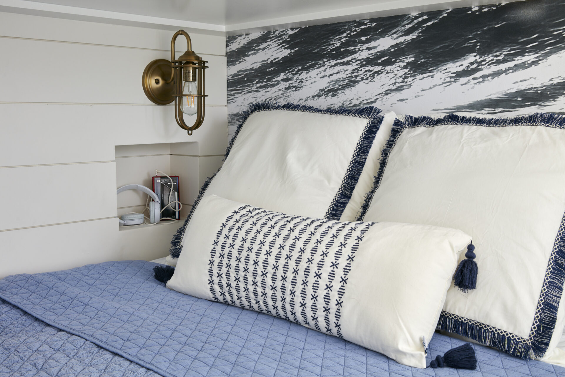 The gold accents continue in the bunk room with classic Marnie Custom Home signature bunk room details including drawer stairs for extra storage, trundle pullout, folding top rail to make beds easier, and of course light and electrical outlets in each nook.