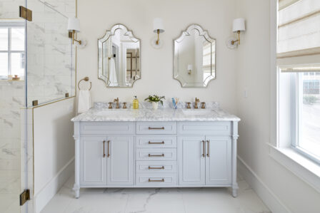 We added a bit of glam in the kitchen with gold accents including gold-lined light fixtures and gold hardware. We also broke up the all-white palette with a bit of gray in the kitchen island cabinets, barstools and marble backsplash.