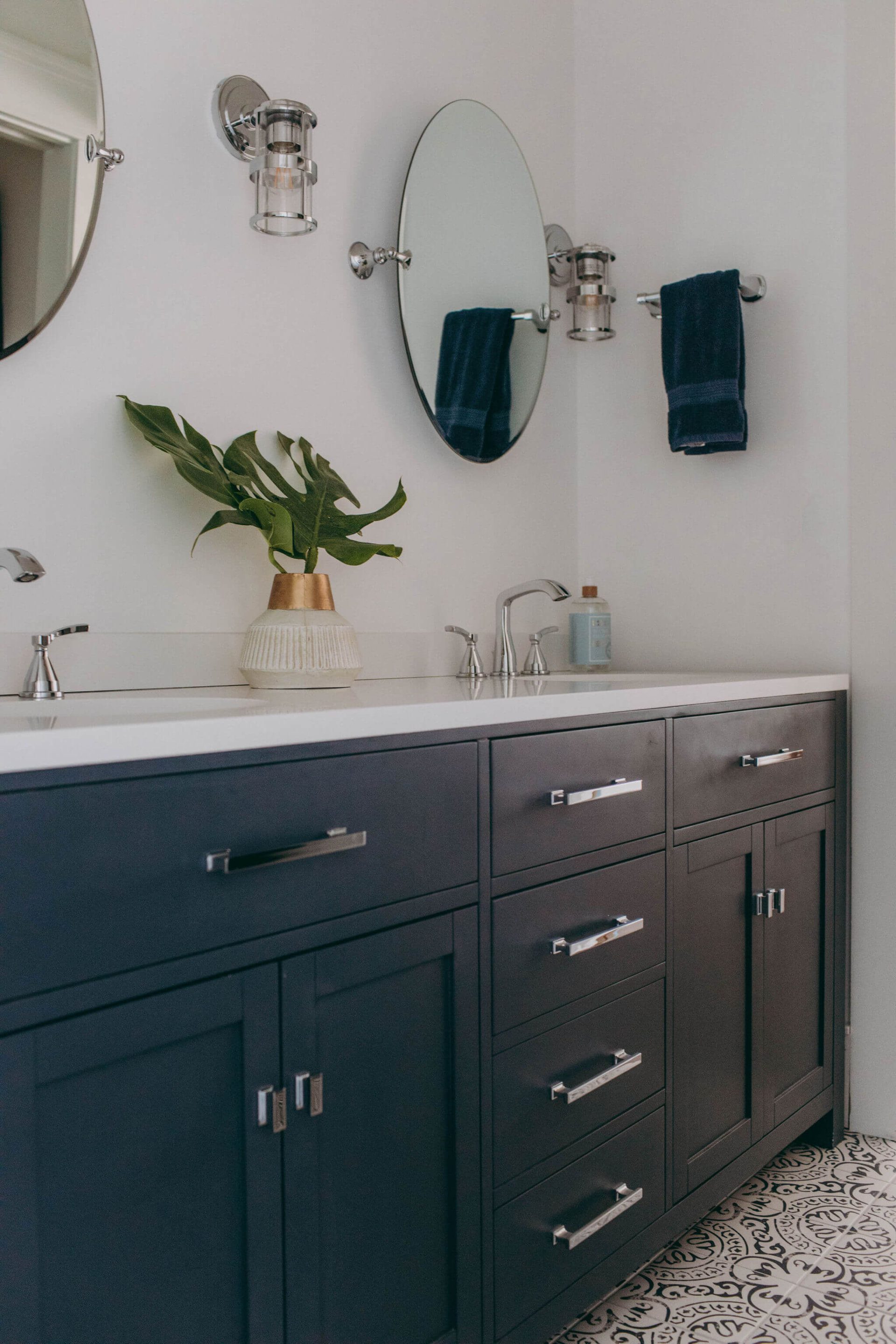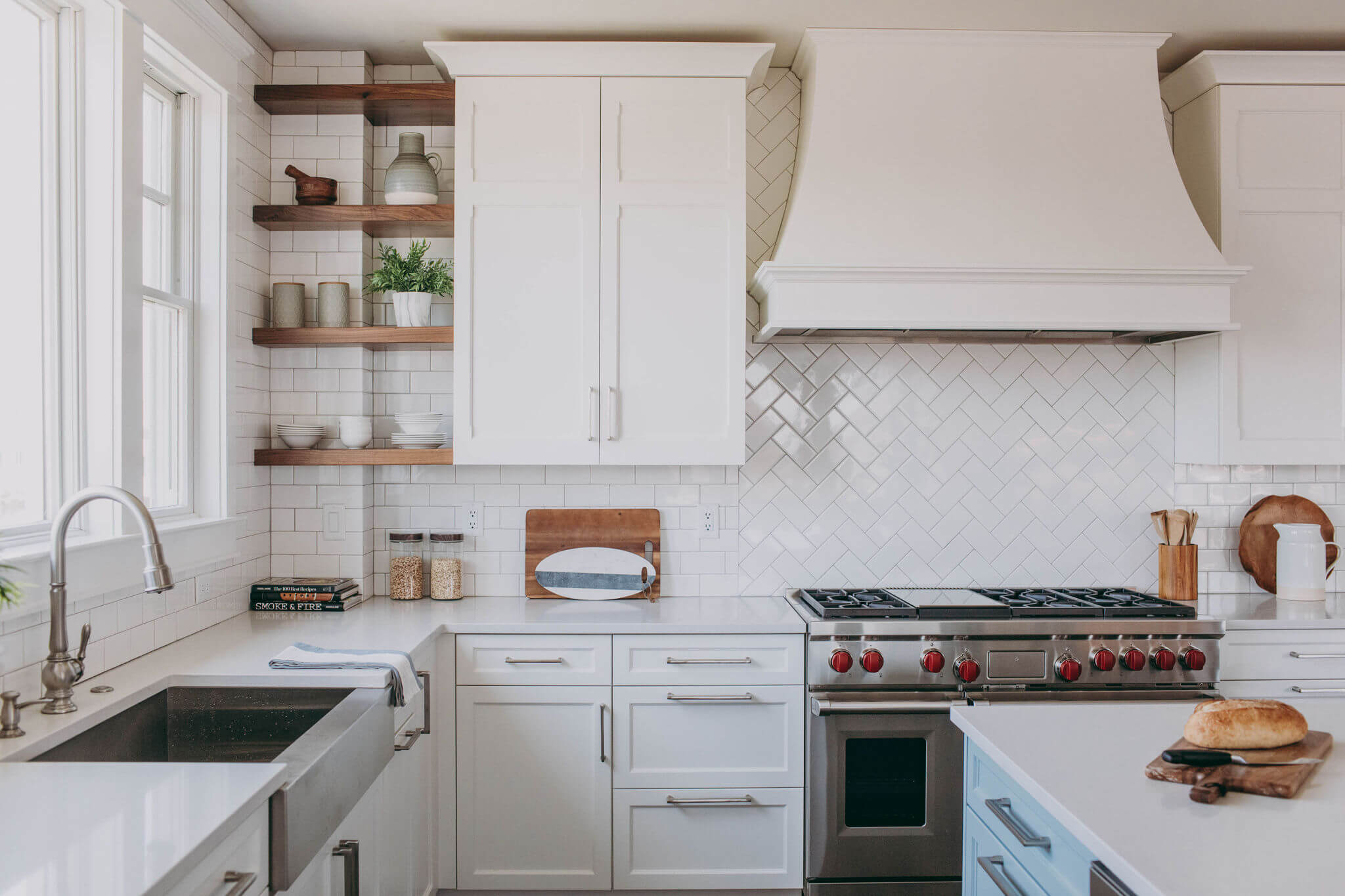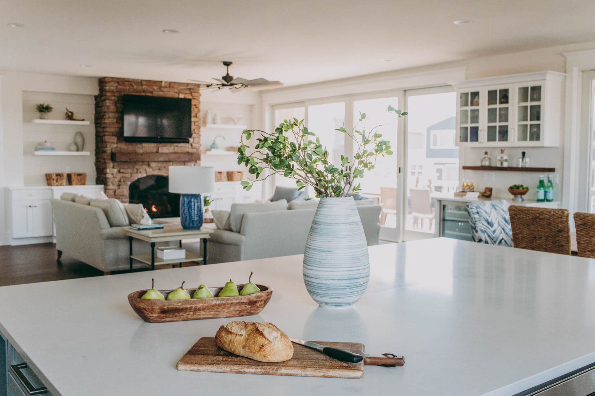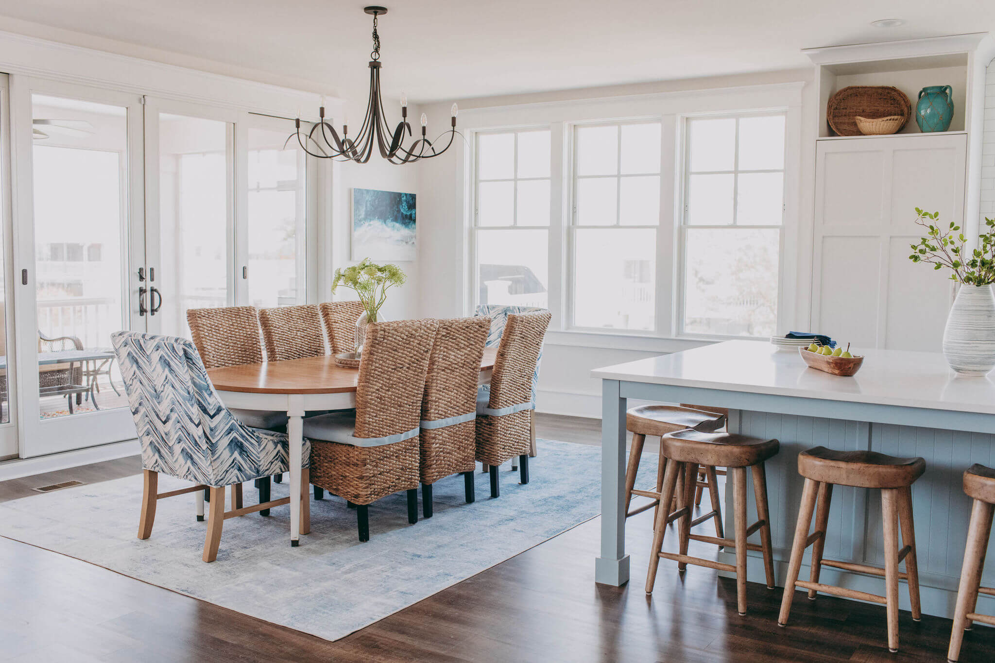 The kitchen features quartz countertops, an oversized island that seats six, a separate walk-in butler’s pantry, and a bar off the dining area. We warmed up the white kitchen with wood-toned open shelves and an island painted in the calming Benjamin Moore Santorini Blue.