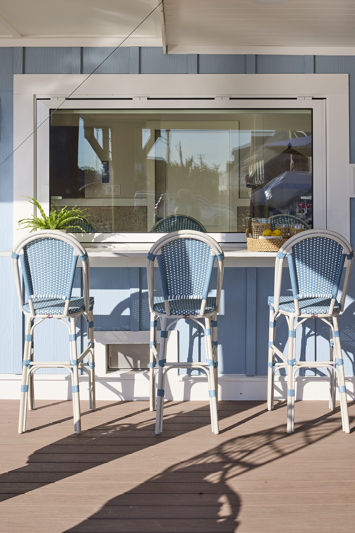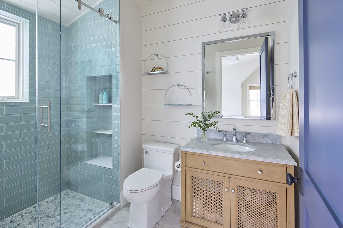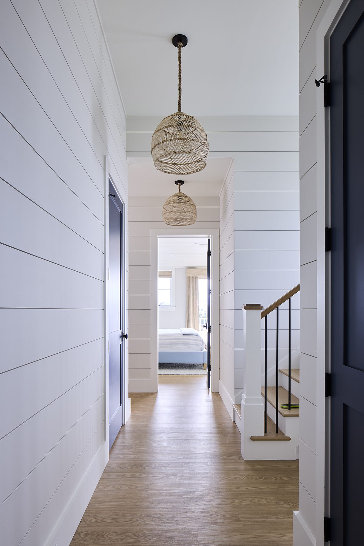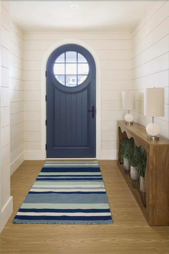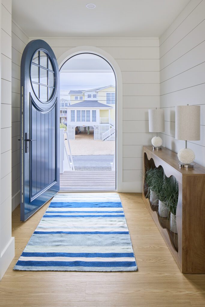 The exterior of Breezeway is coastal cottage at its best. A rounded front door in Sherwin-Williams Rainstorm sets a welcoming, distinctive tone that you don’t see often, and paired with classic Bahama shutters, slate blue siding and a great front porch, it oozes coastal charm.