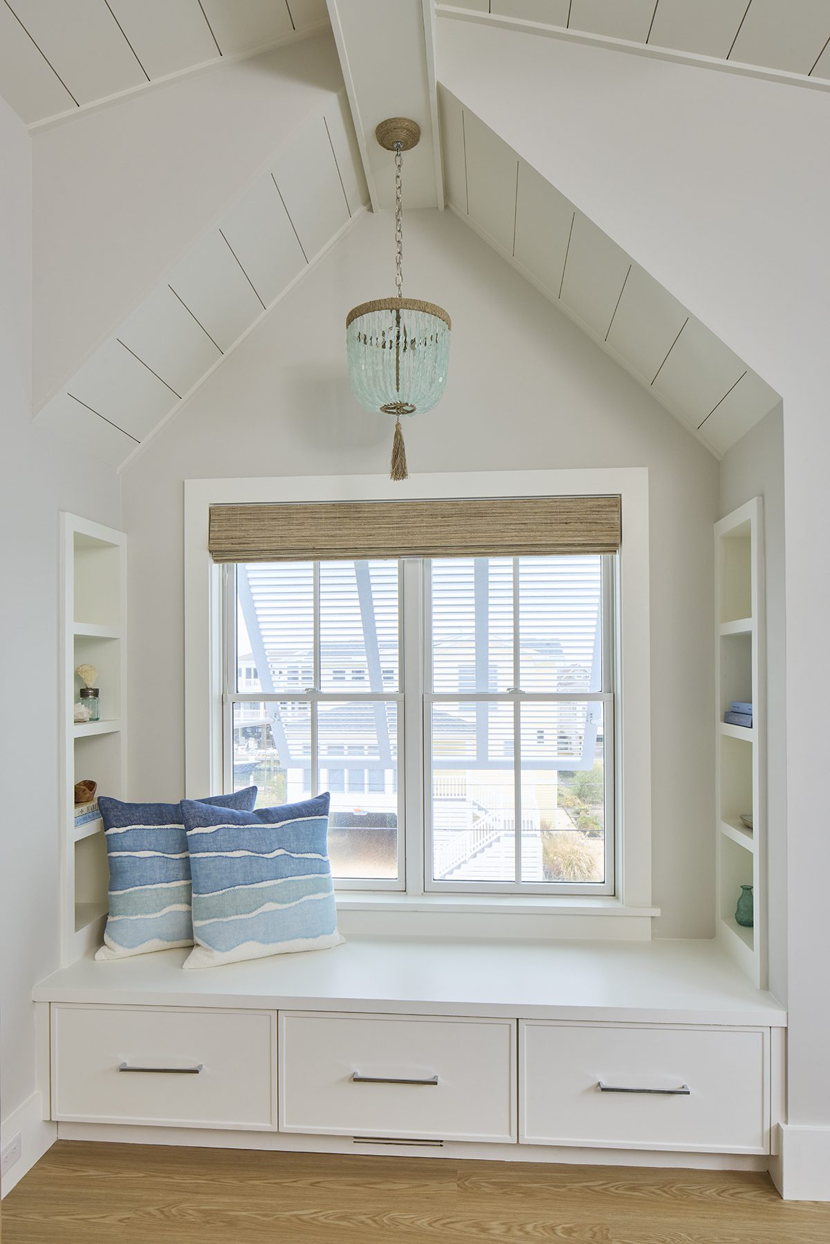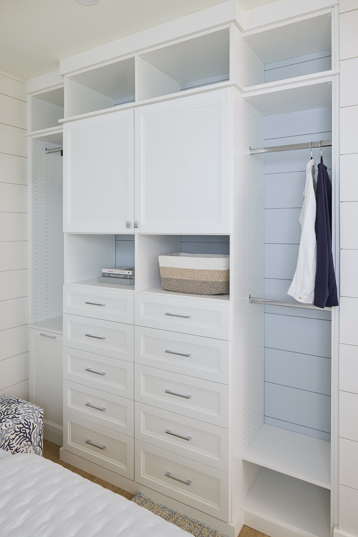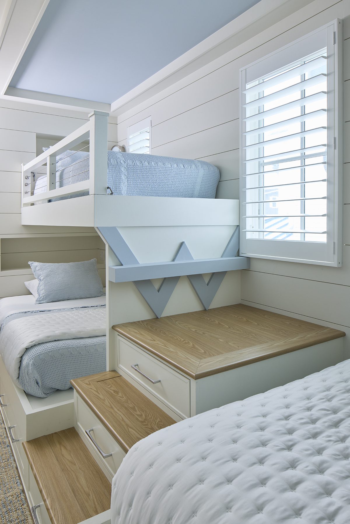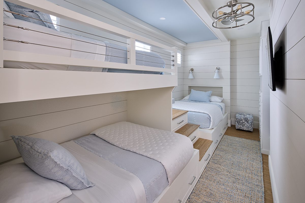 Every beach house needs a great bunk room and it’s a MCH signature element of our beach homes. This space was very narrow: so we custom-built these bunks with built-in storage and closets to make the most of every inch.