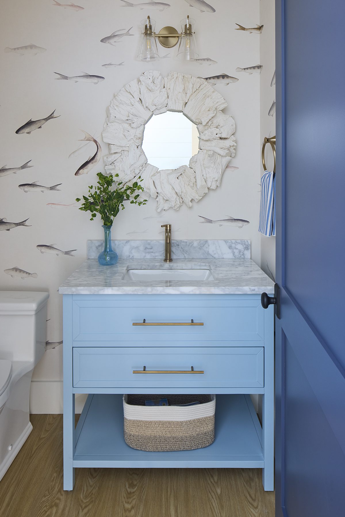 The powder room is one of my favorite places to take a design risk. It’s small, it’s contained, and it’s a place guests always notice. This fish mural wallpaper from Etsy is so fun and paired with the coral mirror, it’s a sweet little bathroom that makes me smile.