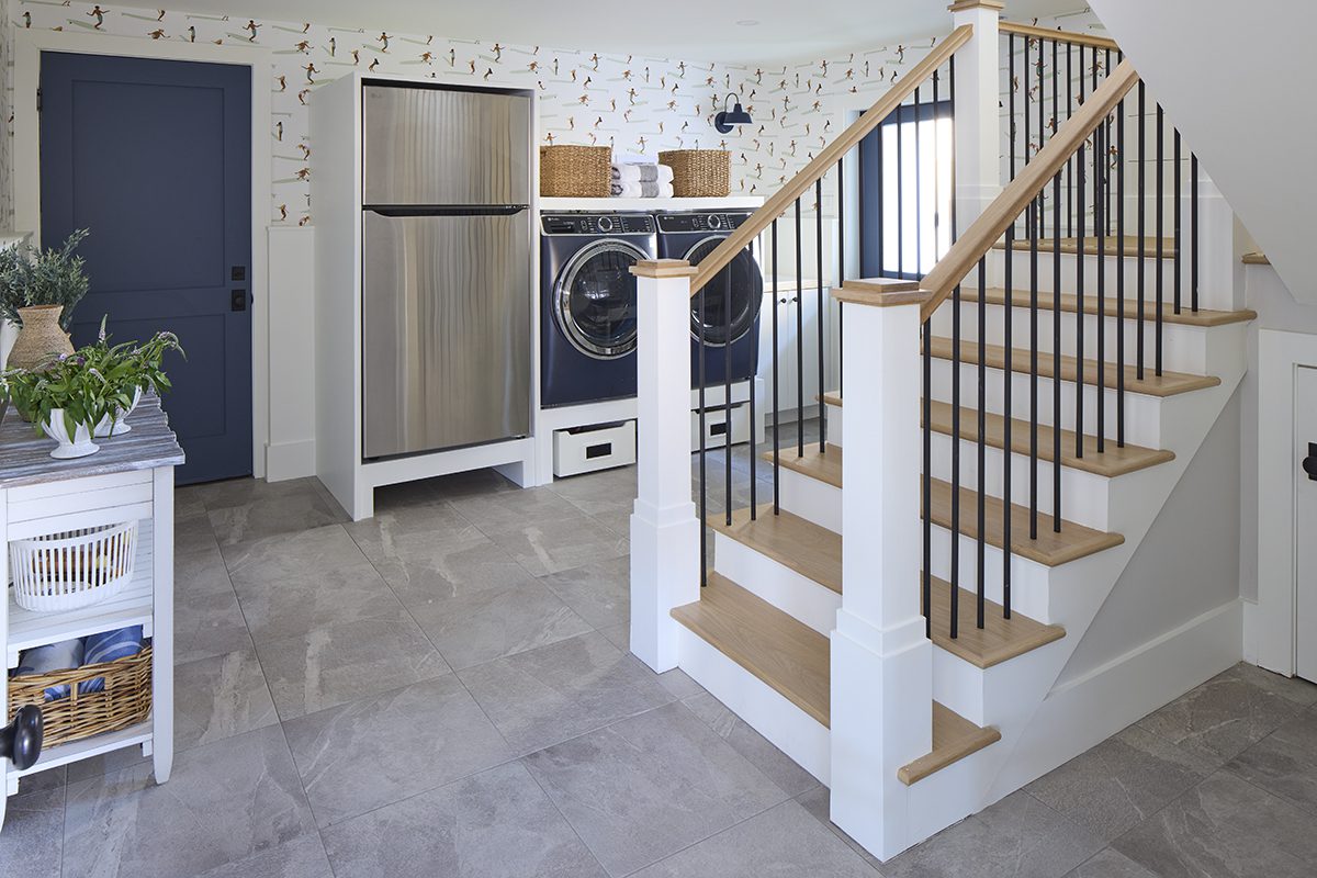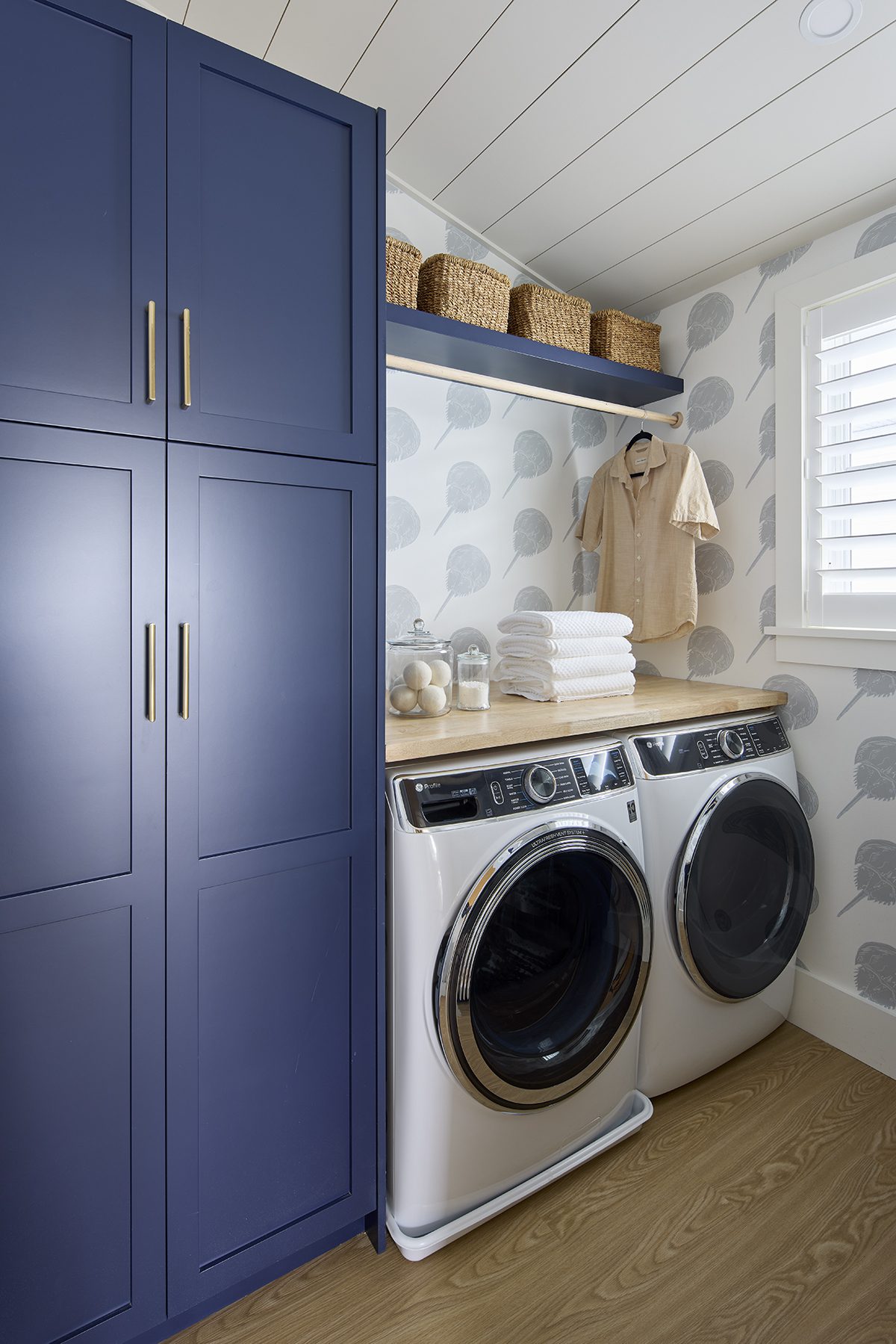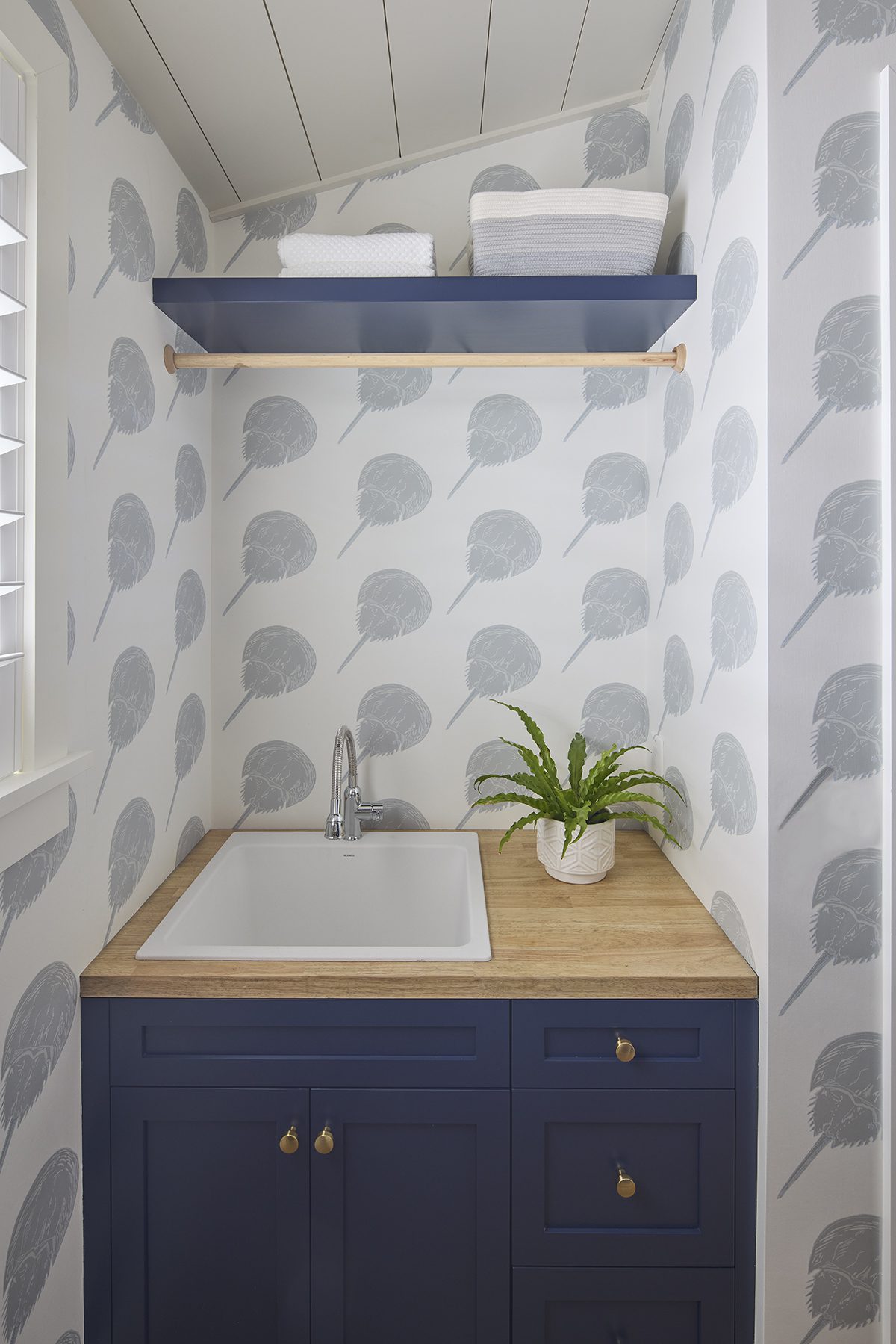 Even the laundry room got a moment with this playful horseshoe crab wallpaper from Spoonflower.