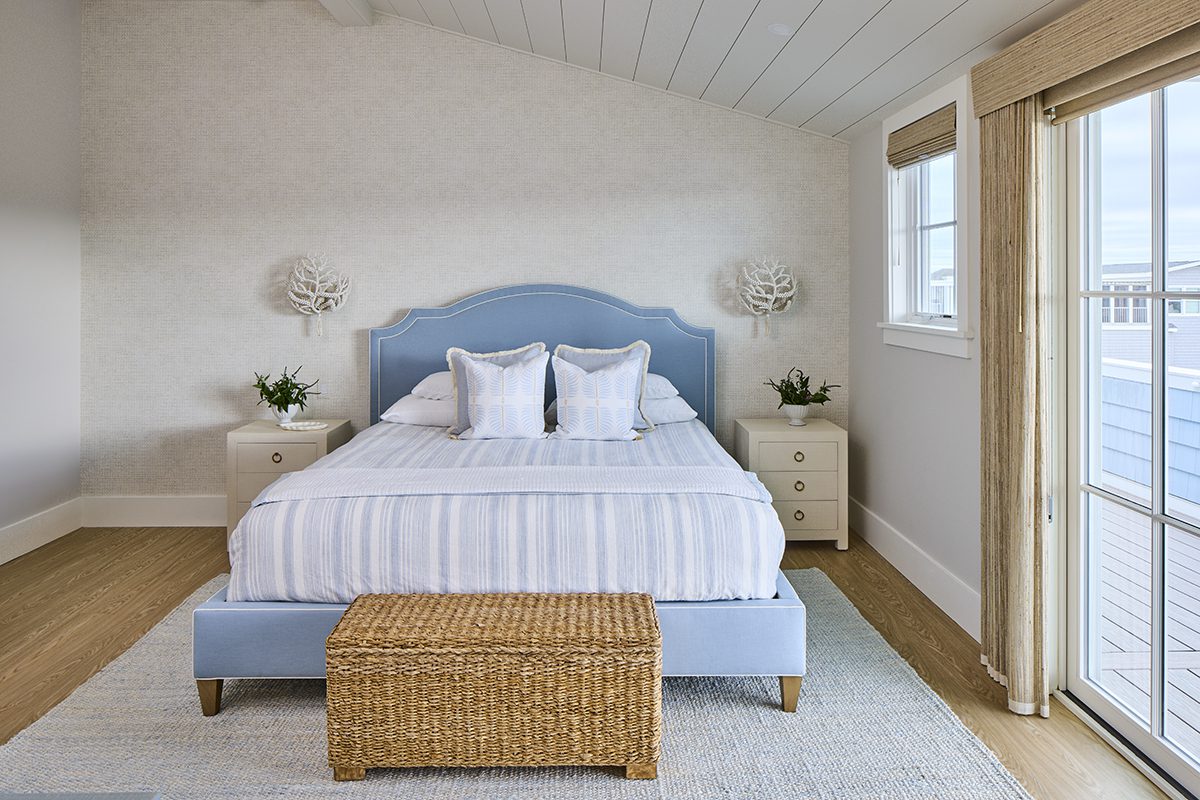 The Serena & Lily Loire Bed in Coastal Blue is a stunner and paired with their Sanibel sconces, really elevate the room.
