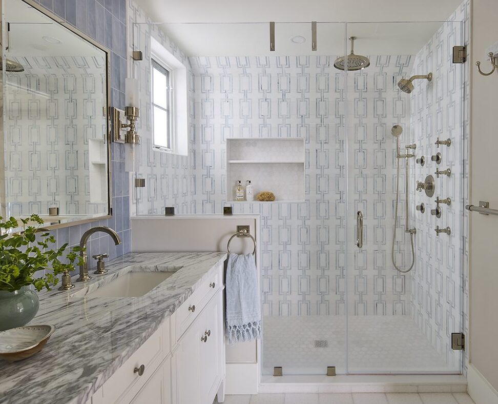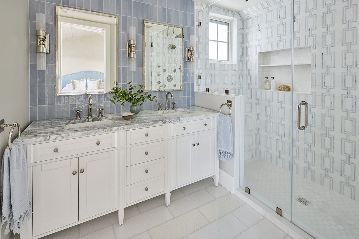 The tile in this bathroom make me so happy! Sophisticated and spa-like, the Levante Brisa Glossy tile from Tile Market on the vanity wall brings a soft, handmade quality I love, while the Costes Stone with Glass Mosaic in the shower adds a beautiful, dimensional layer of texture.
