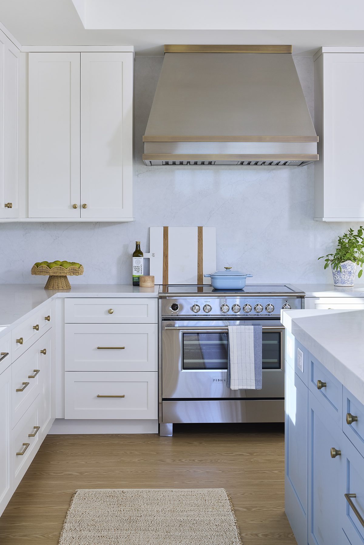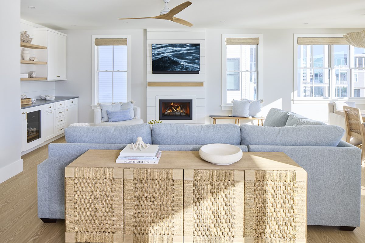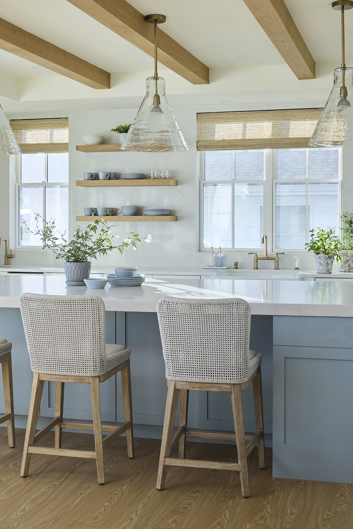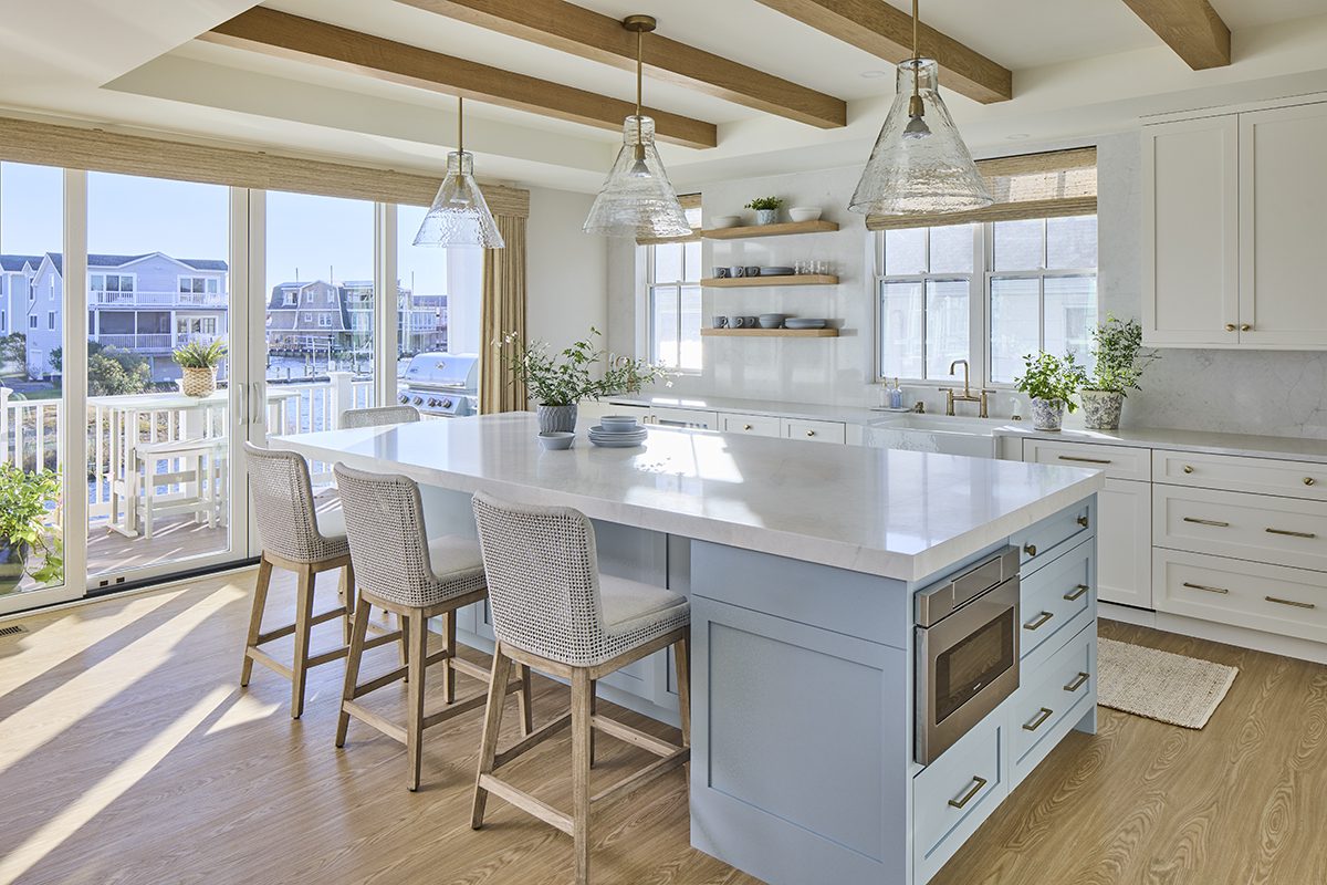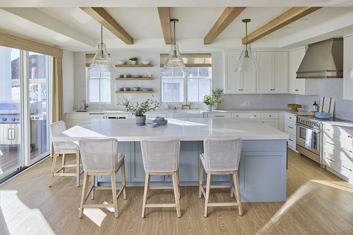 The kitchen is bright, open, and designed for the way beach families actually cook and gather. Custom cabinetry in Benjamin Moore White Dove keeps the palette clean and timeless, while the BM Santorini Blue island adds a hint of coastal color that ties the whole space together.
