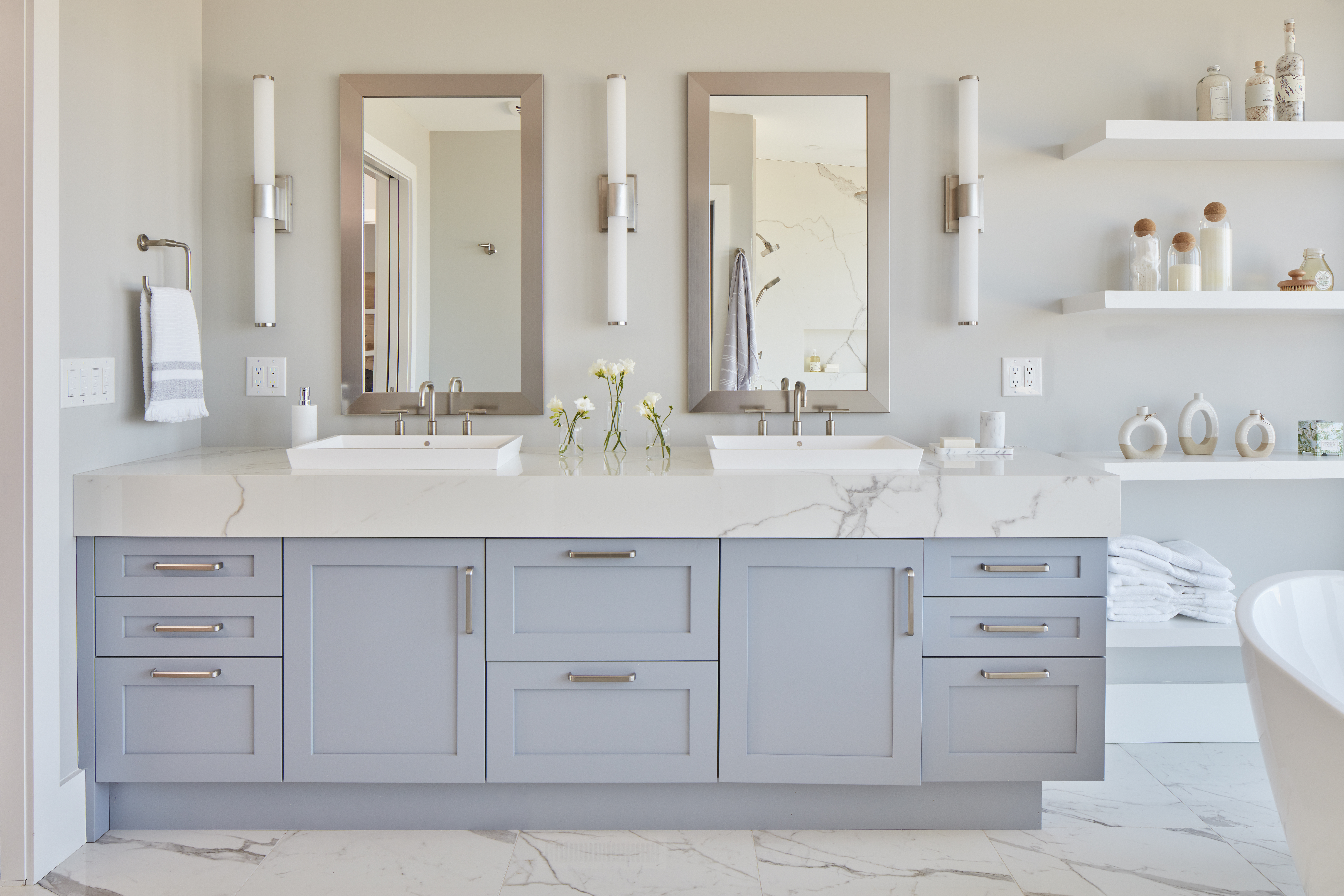 2. In our Gratitude project, I incorporated wallpaper within the stairs which matches the Serena & Lily whale wallpaper in the adjoining bath. This space is perfect for kids, again with pullout storage on the staircase and underneath each bottom bunk. Photo by Keyanna Bowen
