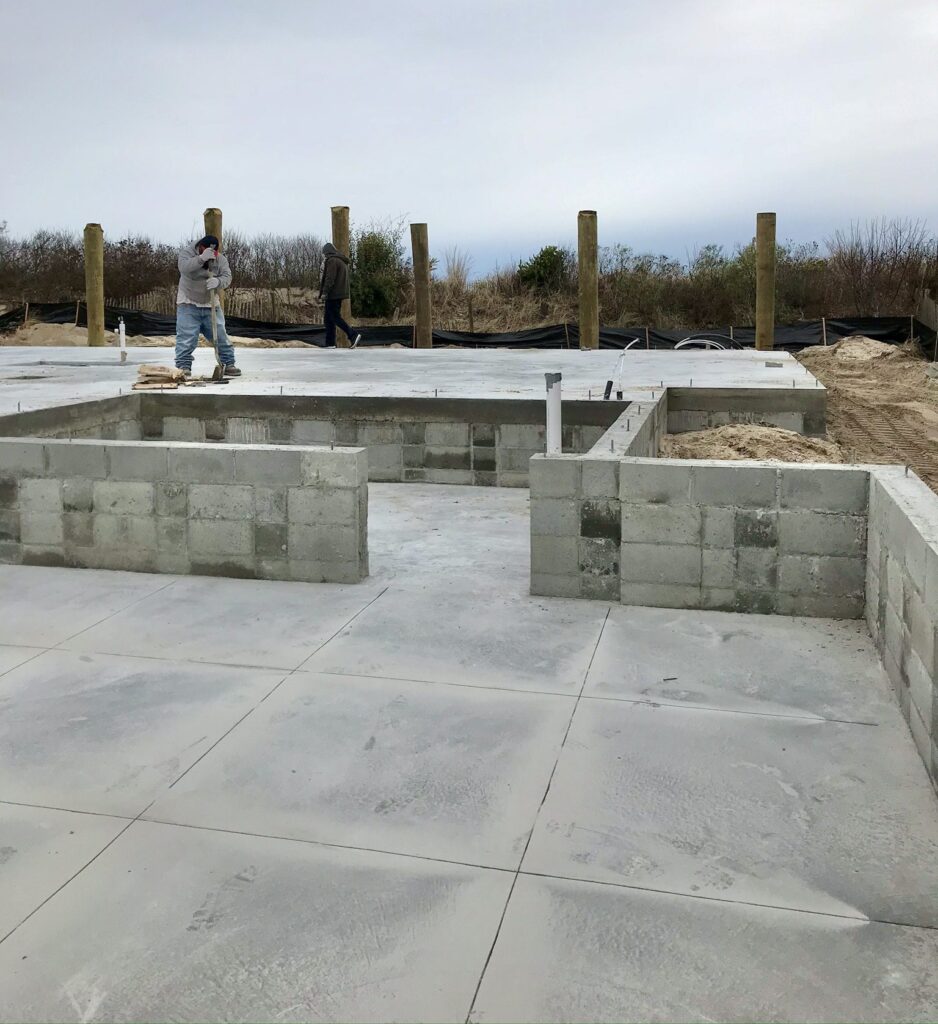 Flooding is another big challenge. We cant build finished living space below the base flood elevation, that line in the sky” FEMA dictates, so below that level, we build the foundation to break away safely if a storm pushes water through. Instead of a standard slab, we use smaller cinder blocks filled with concrete and built in a specific pattern that lets water push through without taking down the main structure. Even the garage floor is designed with a thinner 2” vs 4” frangible concrete slab so that if it breaks away, it does so in little pieces without damaging neighboring properties. Its one of those details most homeowners never see, but its what keeps our homes and communities safe.