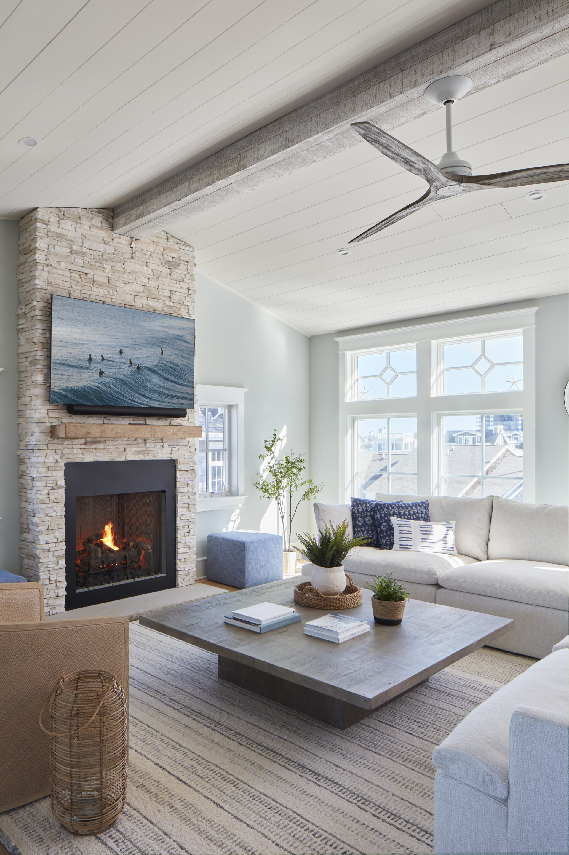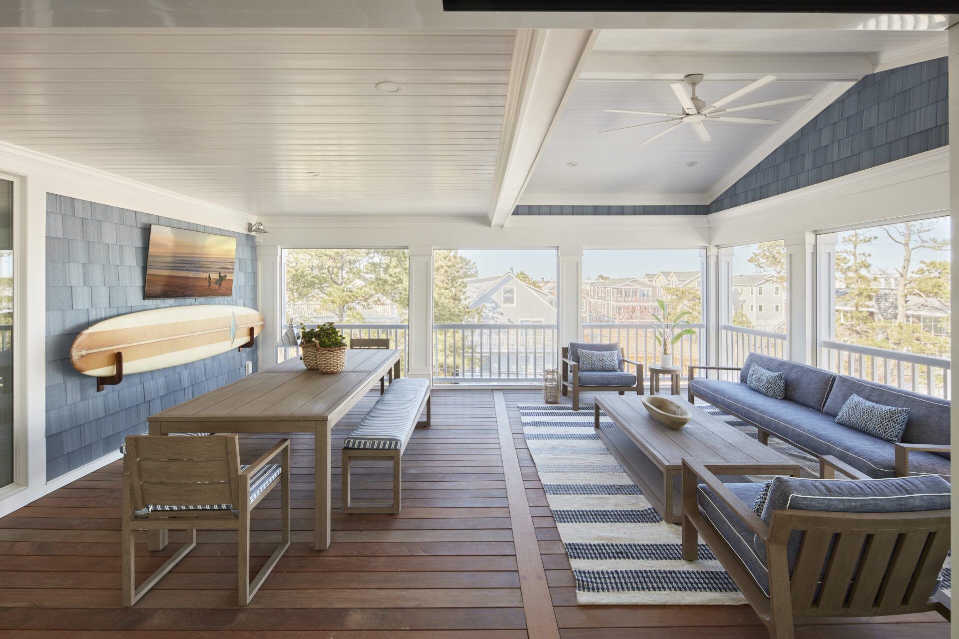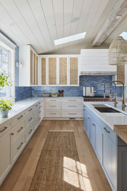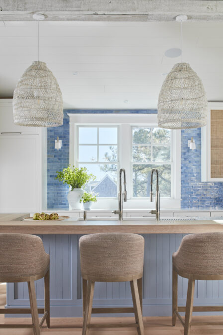 Spanning 4,700 square feet with 6 bedrooms and 6.5 baths, this beach house features two custom bunk rooms, a rooftop deck, and signature millwork throughout, including an under-stair reading nook and beach prep room. From the teal bunk room inspired by the homeowners’ favorite beach bar to the pebble tile outdoor shower, every element exudes coastal charm.