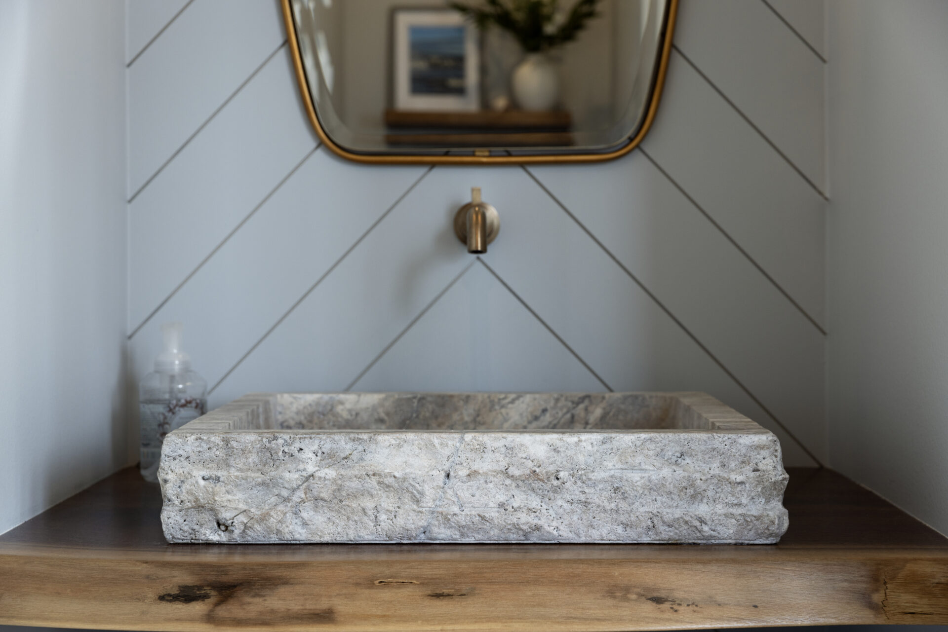 The “transitional coastal” style merges traditional and contemporary features in this home. The neutral siding with black windows, black gas-lit lanterns, and cable railings give the exterior a modern edge. As Marnie likes to say, “the ocean is the show,” so she designed the interior to be neutral and calming, allowing the stunning ocean views to take center stage. The main living areas feature white and light wood tones, complemented by blue and black accents, creating a soothing backdrop that frames the ocean like a work of art. The fireplace surround is adorned with ribbon porcelain tile that mimics the look of wood, adding texture. Black-framed windows with clean lines and no grills provide a modern look, while window seats enhance the natural light.