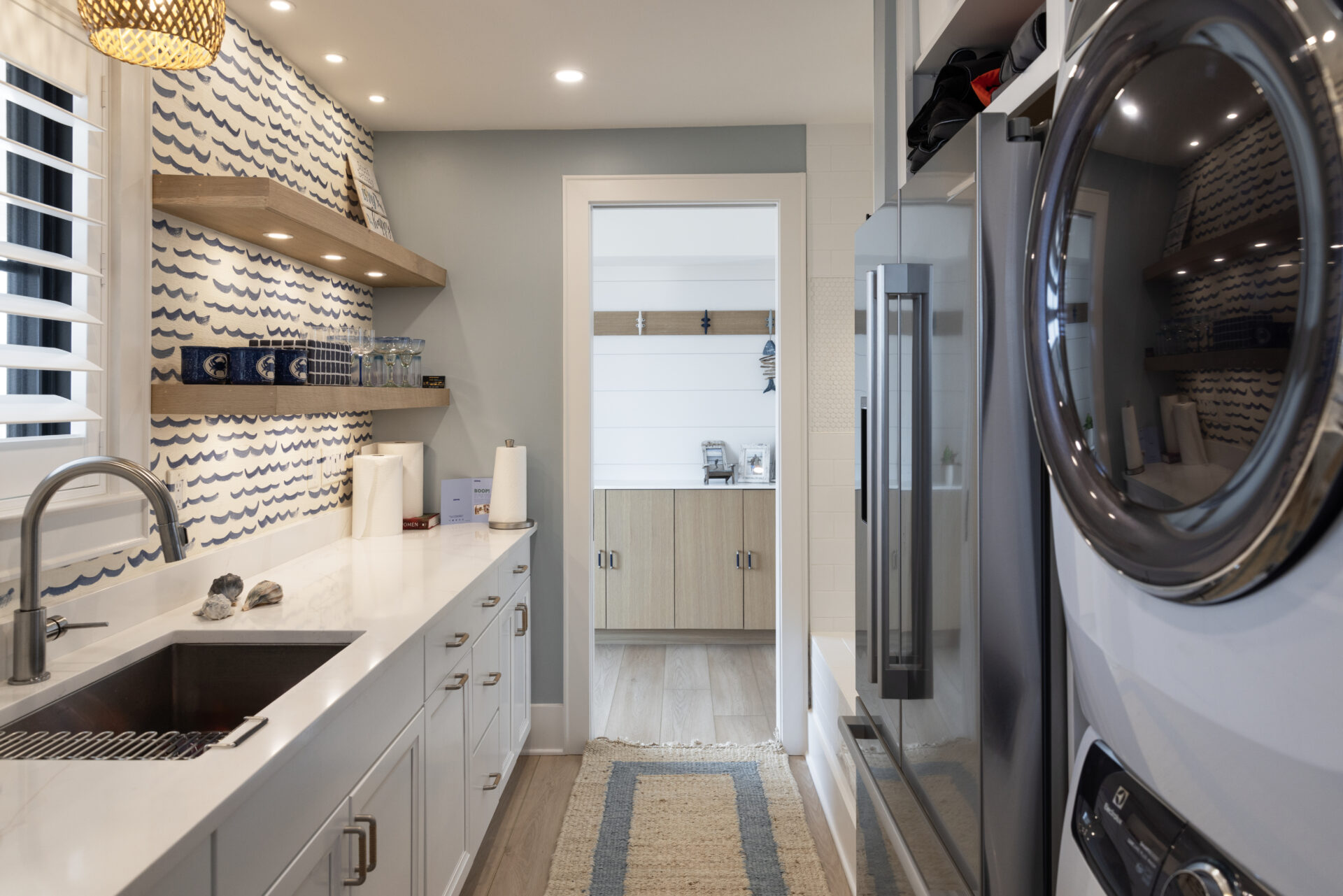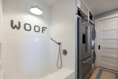 Pets played a central role in this home’s design, with our first-ever “Catio” – a dedicated room for the cats. Positioned on the light-filled south side of the home, a sunning ledge beneath floor-to-ceiling windows allows the cats to lounge and nap in comfort. A dog wash station in the beach prep room, complete with custom penny tile playfully spelling out “WOOF,” adds a fun and functional touch. Durable, pet- and kid-proof luxury vinyl plank floors are installed throughout, softened with plush area rugs.