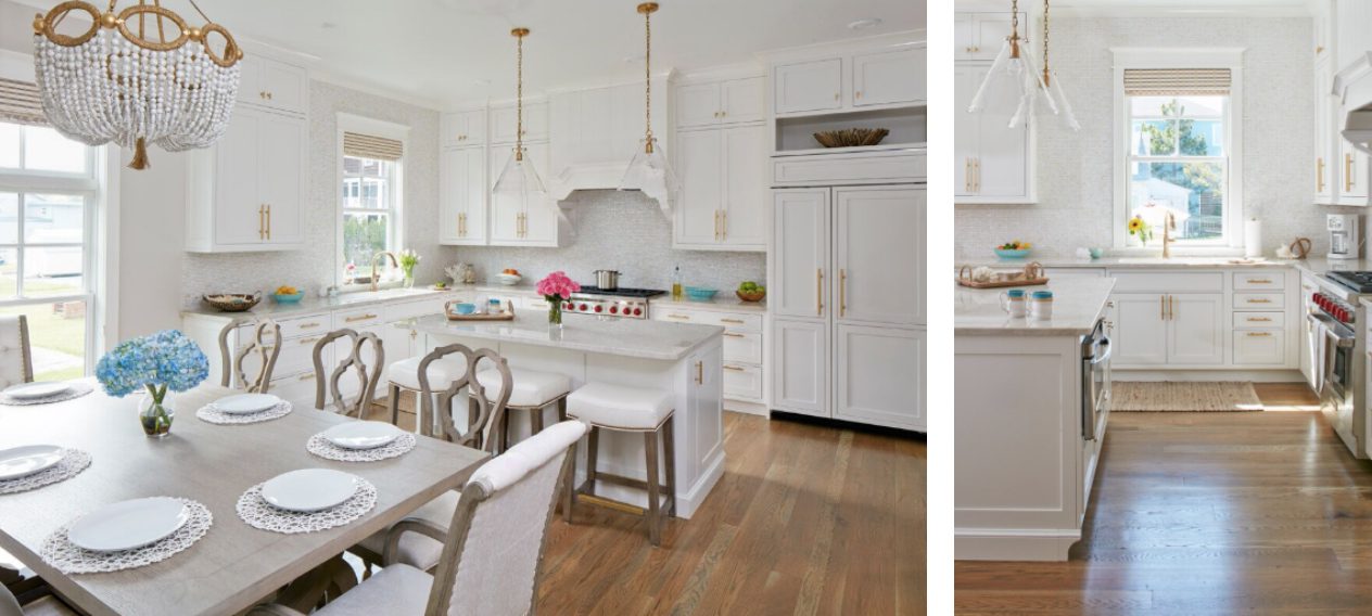 Kitchen cabinets are Brookhaven II by Wood-Mode in Nordic White finish with Urban Modern Freestone 6” cabinet hardware pulls & appliance pulls.