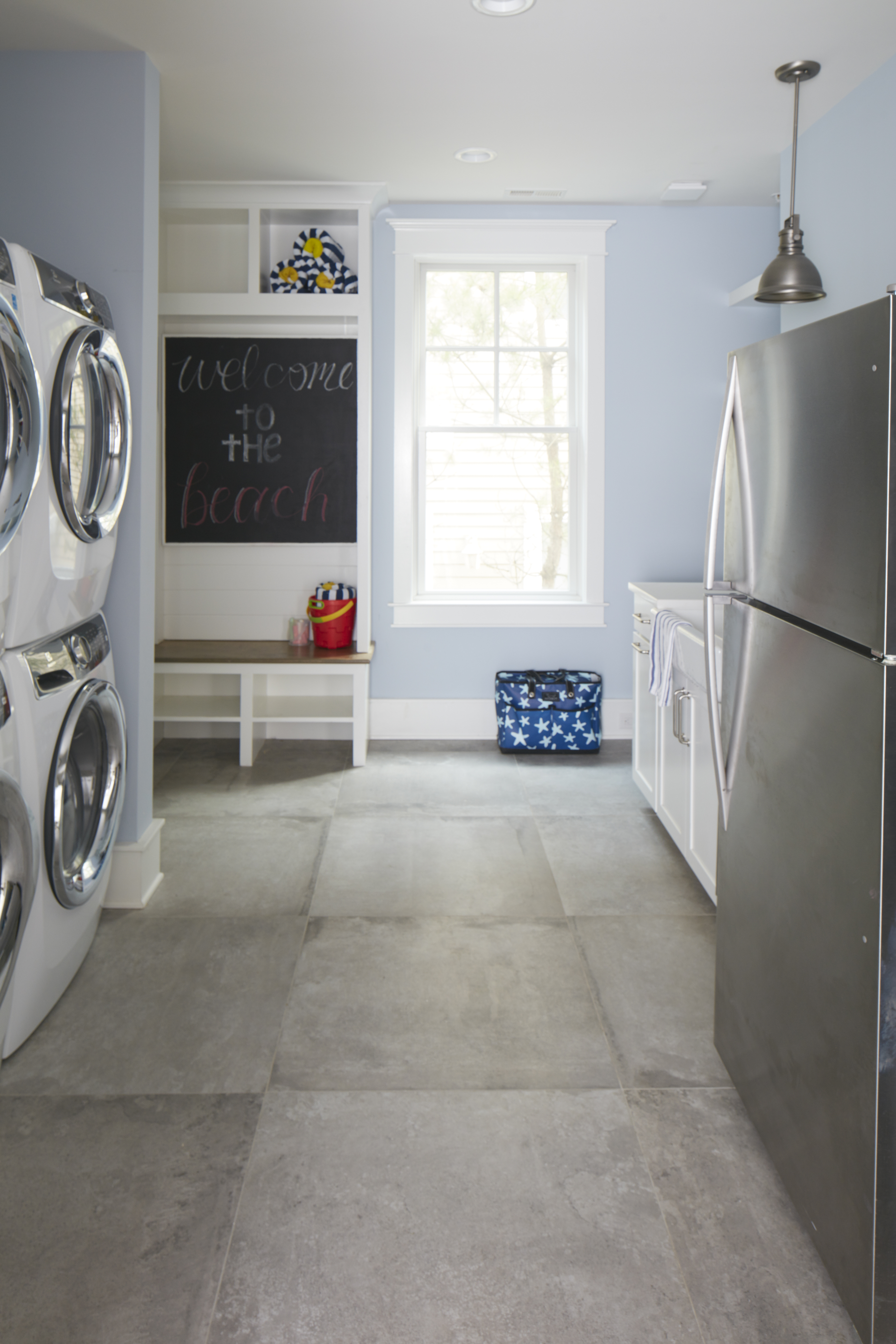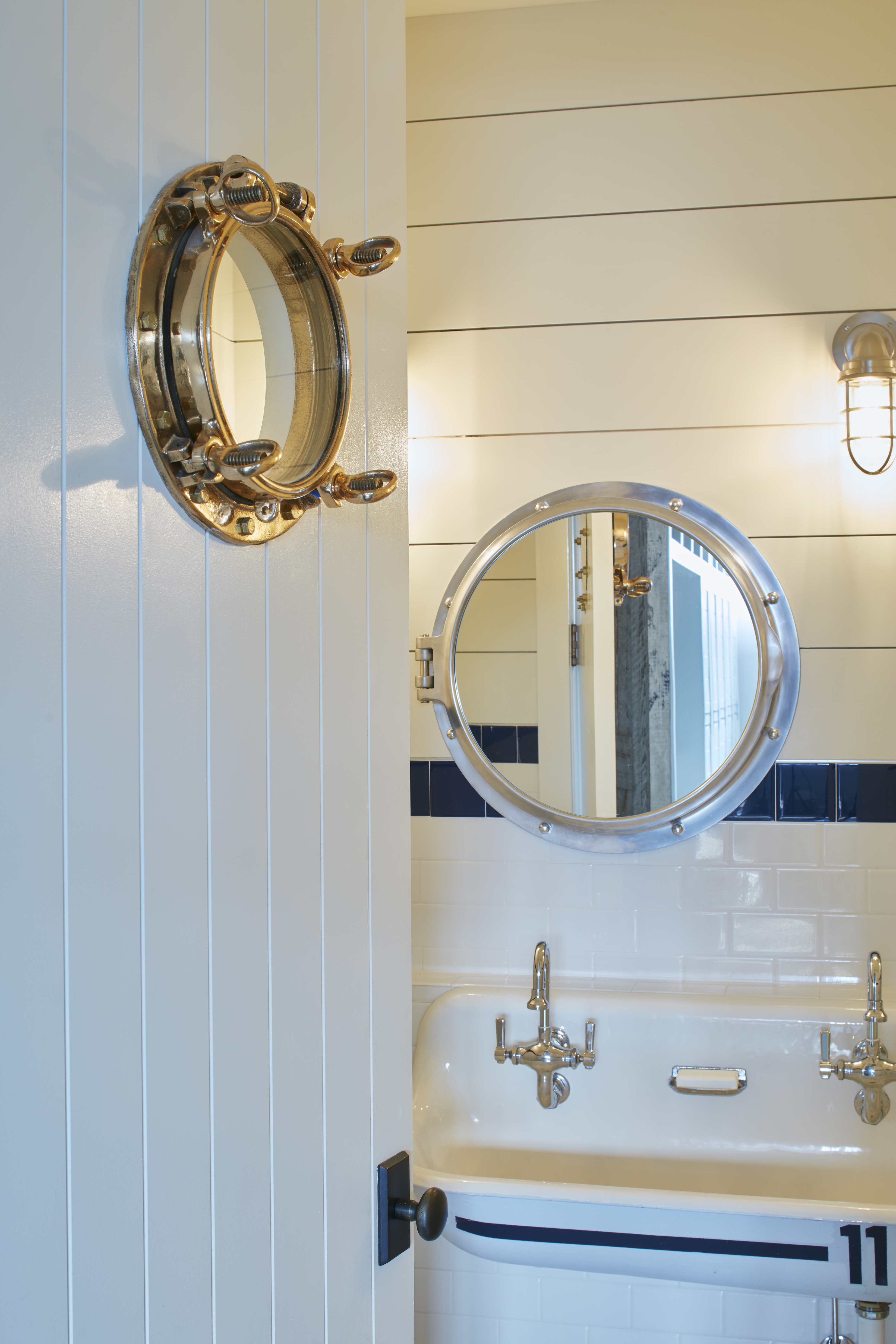 Uniquely-designed interior doors include a 4’ reclaimed wood sliding barn door, a shiplap door with a custom WWII porthole window that was turned into a mirror, an old wood interior door, and a Dutch door leading to the beach prep room that has everything you need to get ready for a day on the beach.