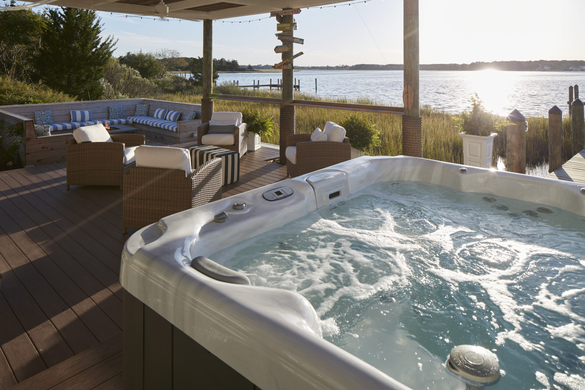 The backyard was designed as a tropical retreat, boasting a built-in fire pit, hot tub, spa-like outdoor shower, and multiple lounging areas leading to a dock with a boat slip.