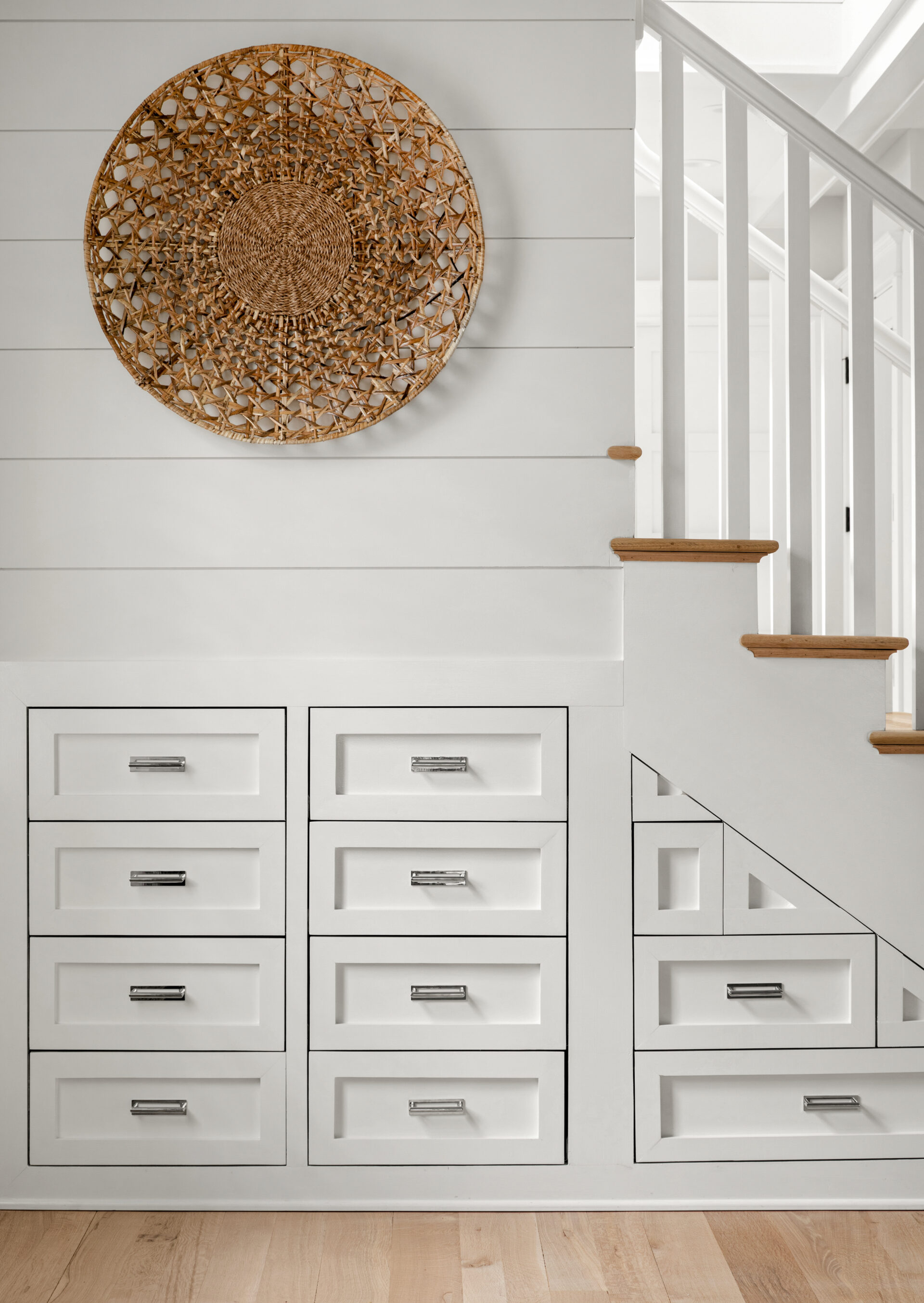 The original house on this lot just one block from the ocean in Middlesex Beach had been in the family for generations. When they outgrew it, they called on us to create a new custom cottage that fits their lifestyle today, while also incorporating elements of the original home. Hardwood flooring from the previous home tops the kitchen island and bar, while the dining room table and backsplash in the outdoor bathroom are also made from the repurposed wood.