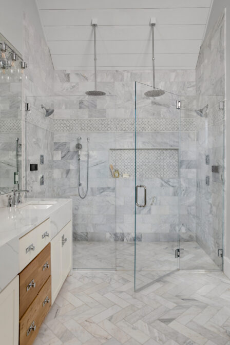 The main floor primary suite features a vaulted ceiling and pocket doors into a bathroom with two-toned vanity and oversized shower finished in Carrara marble. The 3,429-square-foot home offers four more upper level bedroom suites, including one with custom millwork designed by Marnie.