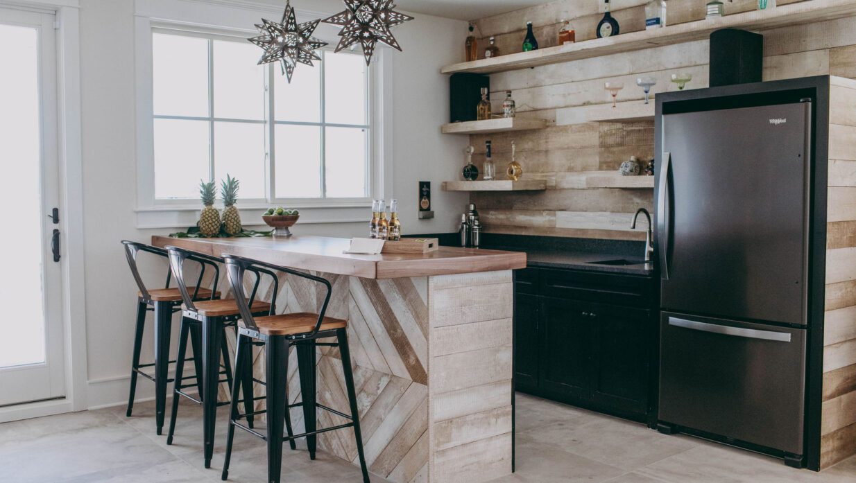 The homeowners wanted plenty of outdoor entertaining areas so we built a screened-in porch, three decks, and a huge patio. In addition, a Mexican-inspired custom bar includes a pass-through window— perfect for serving drinks to guests outside on the canal-front patio. Golden Tee and shuffleboard round out this adult rec room.