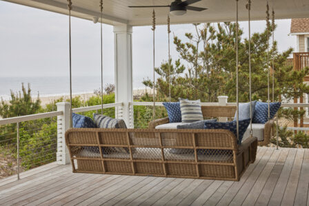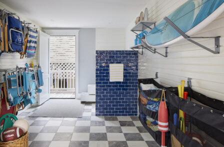 Custom features include an under-stair playhouse, dog wash and feeding station, a unique fishing rod holder as a nod to the homeowner’s love of fishing, a hot tub, an outdoor bar set in the dunes, and a private beach boardwalk. Every bedroom boasts an ensuite bath, ensuring privacy for both family and guests. Adorned with charming blue doors and trim, each space is personalized with custom nameplates featuring beach-themed monikers.