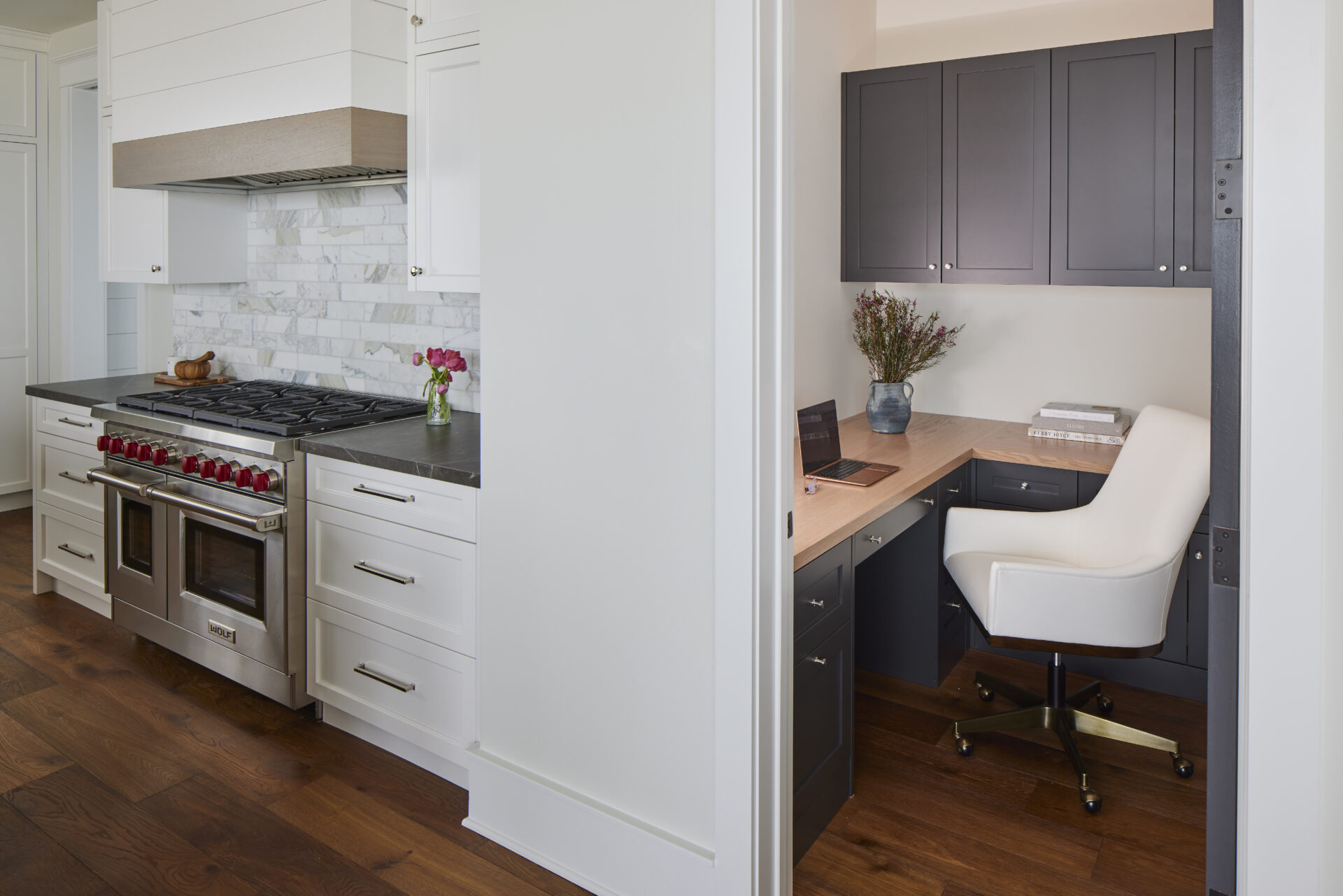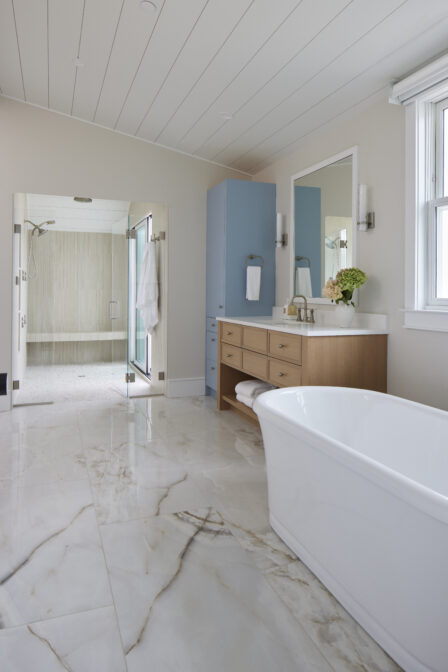 The main living area is the heart of the home where a stunning three-toned kitchen steals the show with white, wood, and blue cabinets. Wall-to-wall sliding doors extend the entire ocean side complemented by remote-controlled screens that allow you to enjoy the ocean breeze without the bugs. The great room features a wood-burning fireplace with a quartz surround and built-ins adorned with the prettiest blue wallpaper that mirrors the hues of the ocean. A cozy office off the kitchen provides a tranquil workspace without sacrificing connection to the home’s vibrant energy.