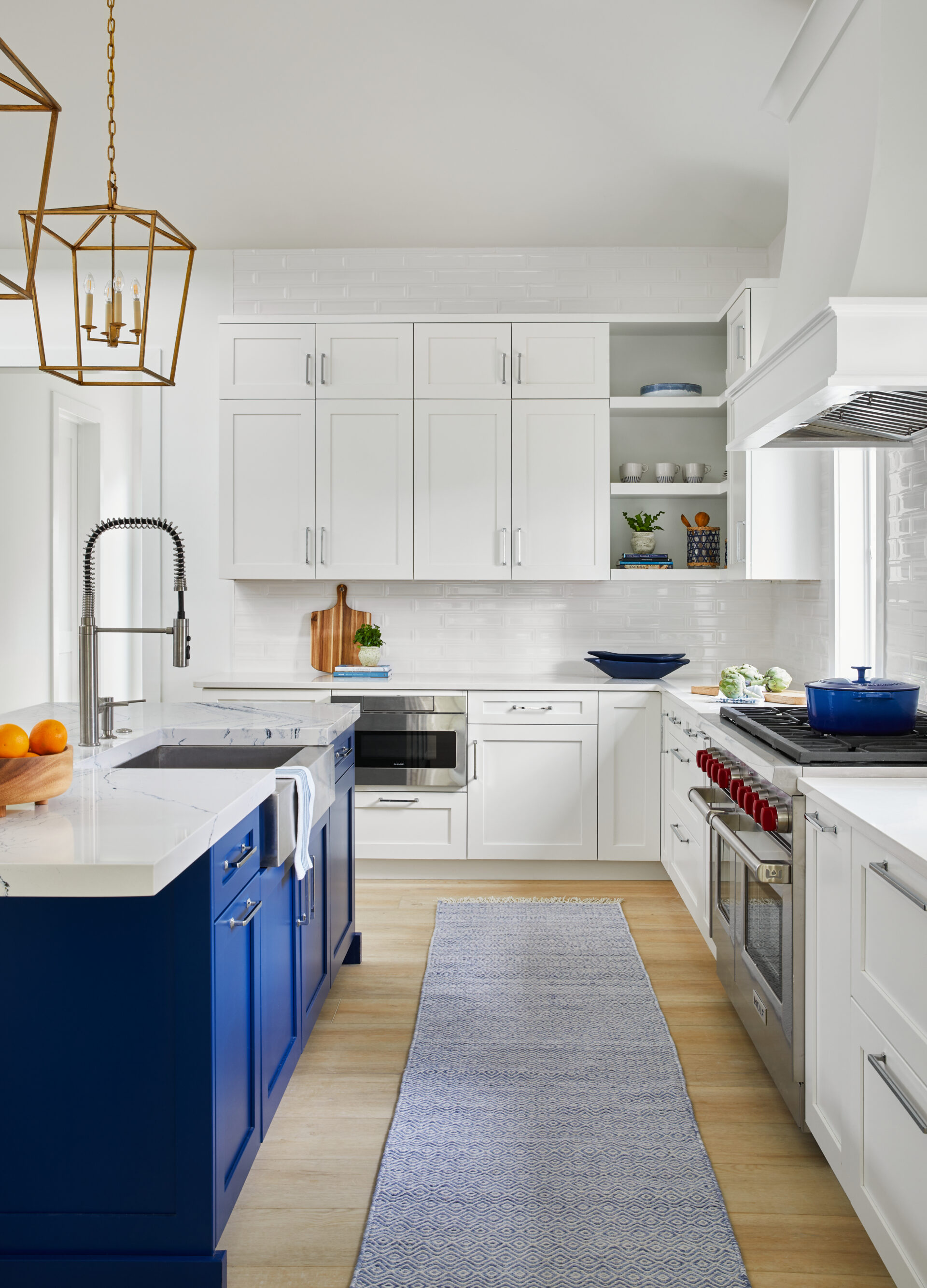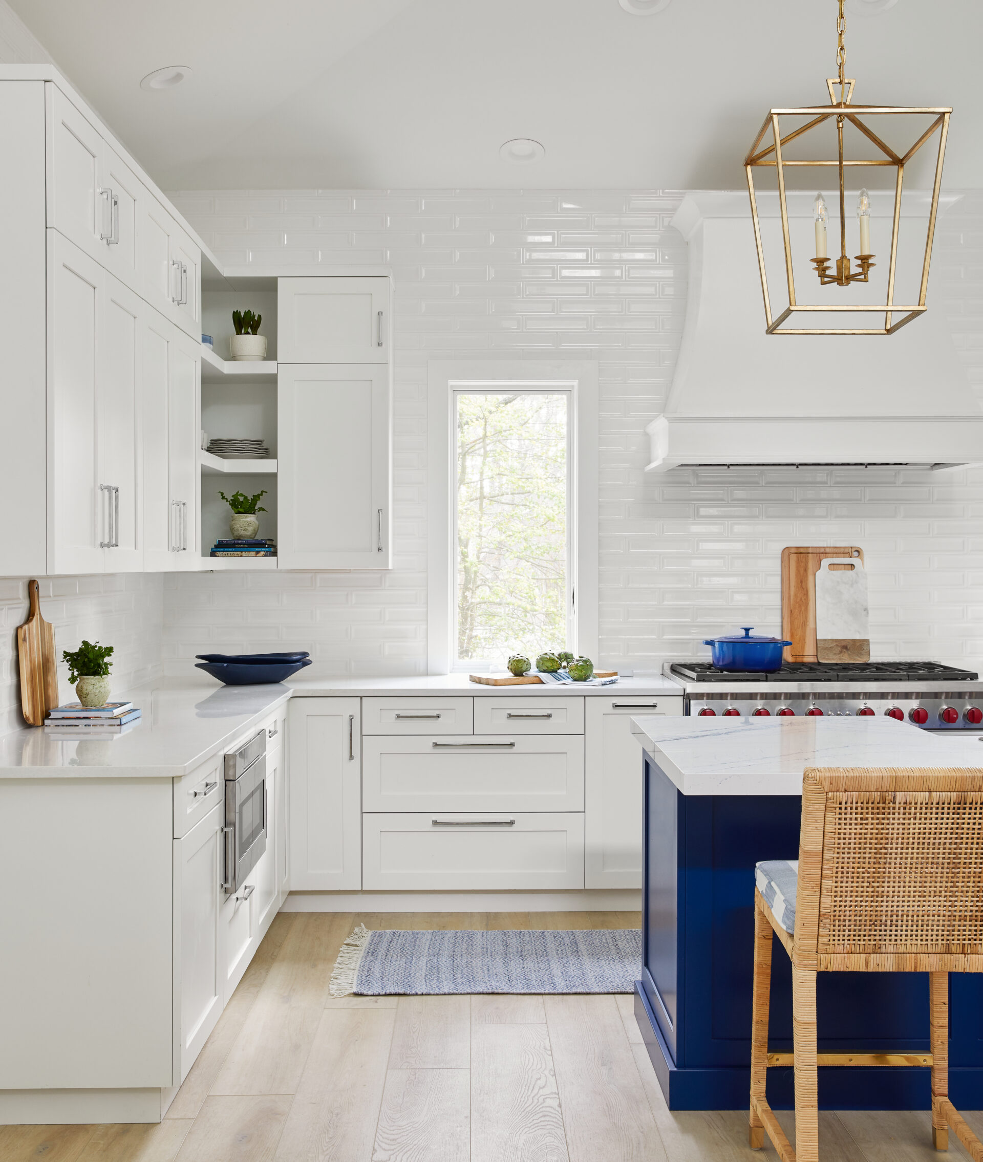 Set among the trees, this new 4,300-square-foot home features beautiful blue and white coastal tones throughout that are fitting for the location. In order to filter in as much natural light as possible, we added a custom light monitor — think massive skylight — filled with glass.