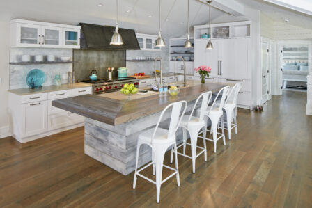 The kitchen boasts an array of materials that gives it a down-to-earth feeling, including a five-foot galley sink and an island that seats six. The counters are a mix of reclaimed wood and quartz, while the backsplash is marble with a zinc hood over the range.
