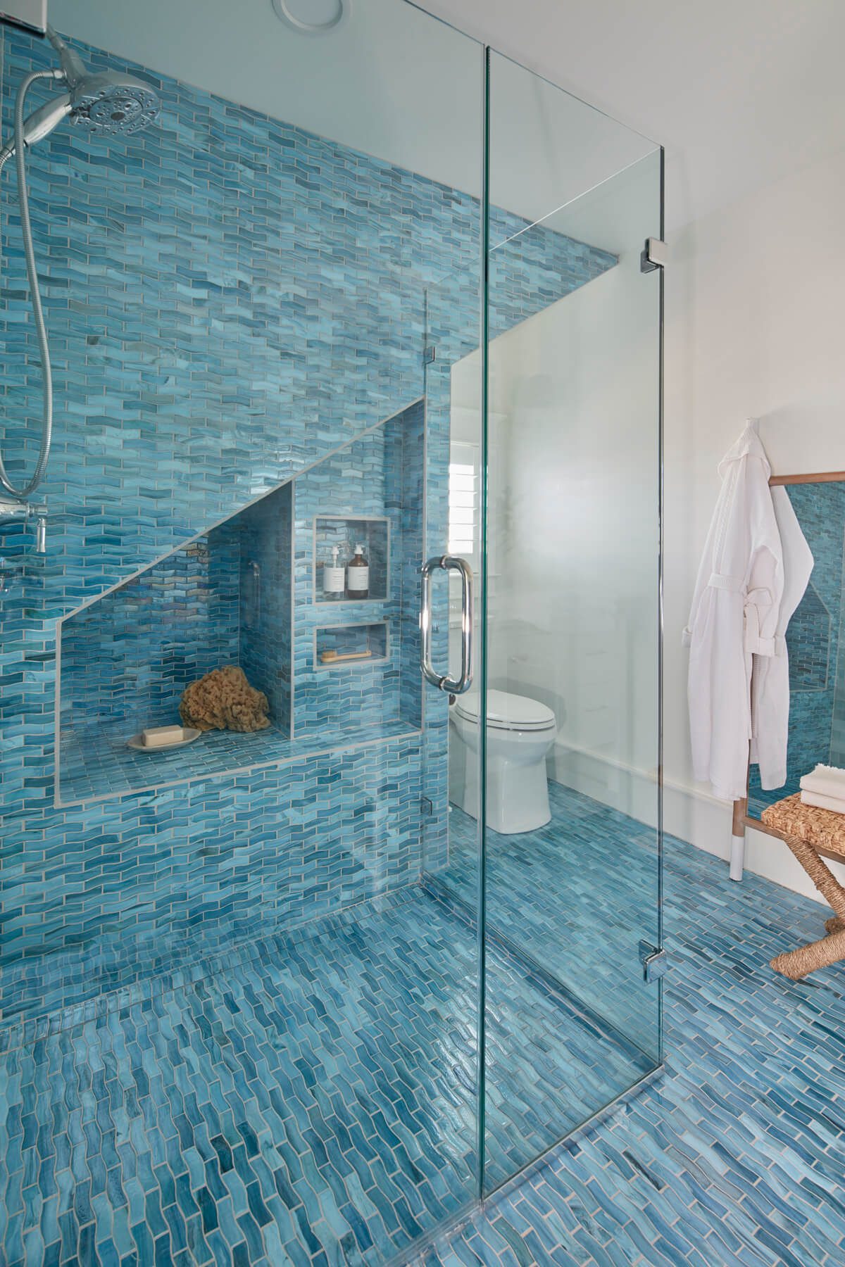 Classic blues and crisp whites complement the random-width white oak floors finished in a custom white stain. The large glass multi-glide door off of the kitchen captures the amazing views of the bay. The stunning kitchen features extra thick porcelain countertops, blue island with matching blue front glass cabinets, and a gorgeous glass mosaic backsplash that glistens in the sunlight.