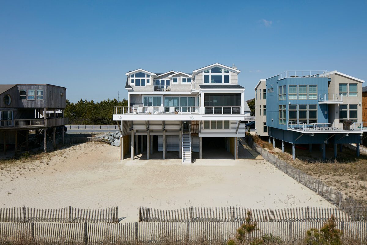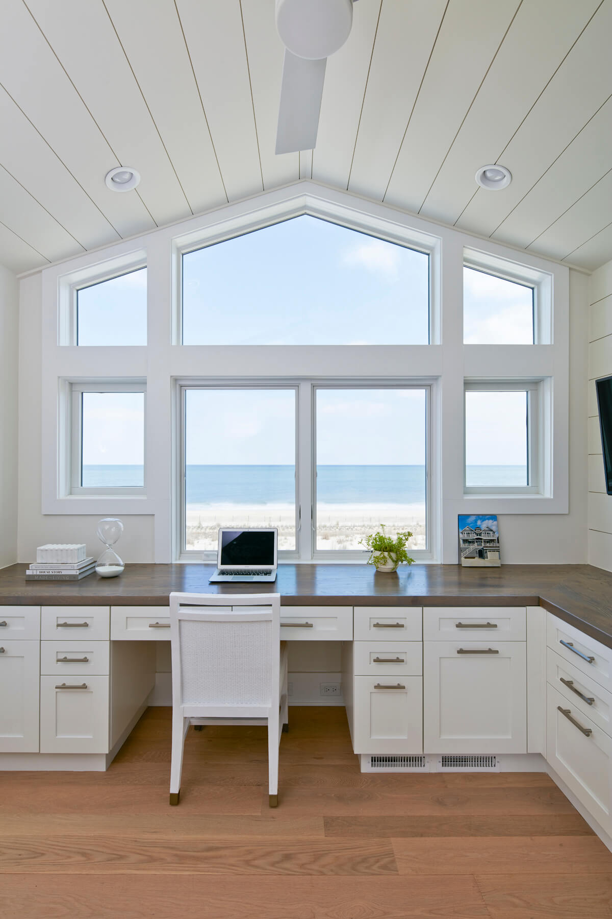 This is the ideal entertaining home for a perfect summer in Bethany Beach. We designed this 5,181-square-foot house entirely around the oceanfront pool and deck, making sure to plan enough room for an entire row of lounge chairs. A custom pass-through bar was purposefully designed next to the built-in grill so you can easily prepare your food and pass it back inside through the retractable sliding window.